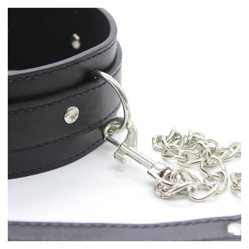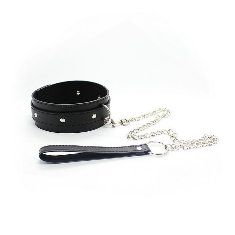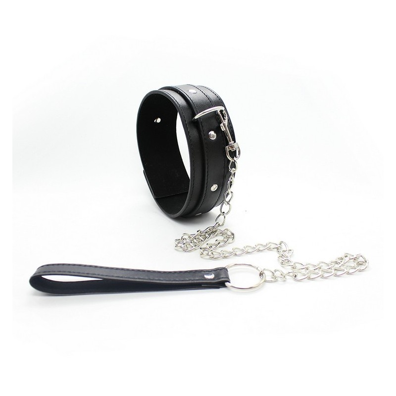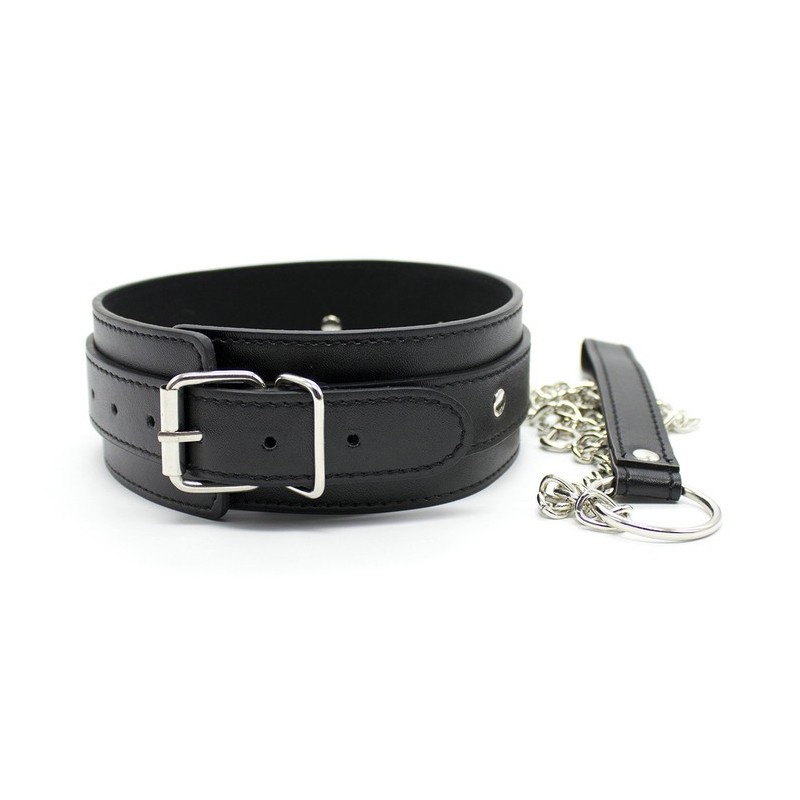 Collar de piel sintetica de color negro con hebilla ajustabe, el collar en el BDSM significa entrega y propiedad y está cargado de un gran valor sentimental, dispone de tres argollas y se puede cerrar con candado para que solamente el portador de la llave pueda abrirlo o cerrarlo. Correa a juego incluída.