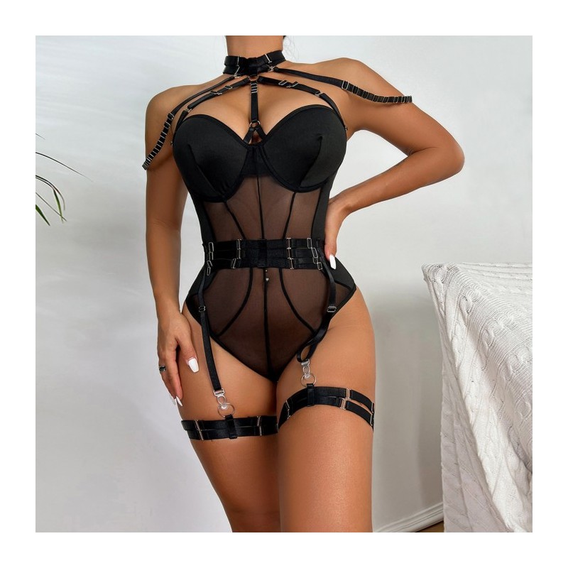 Elegante Body semi traslucido con algo de relleno en las copas , detalles ajustables en cuello y hombros y ligas ajustables en para los muslos.