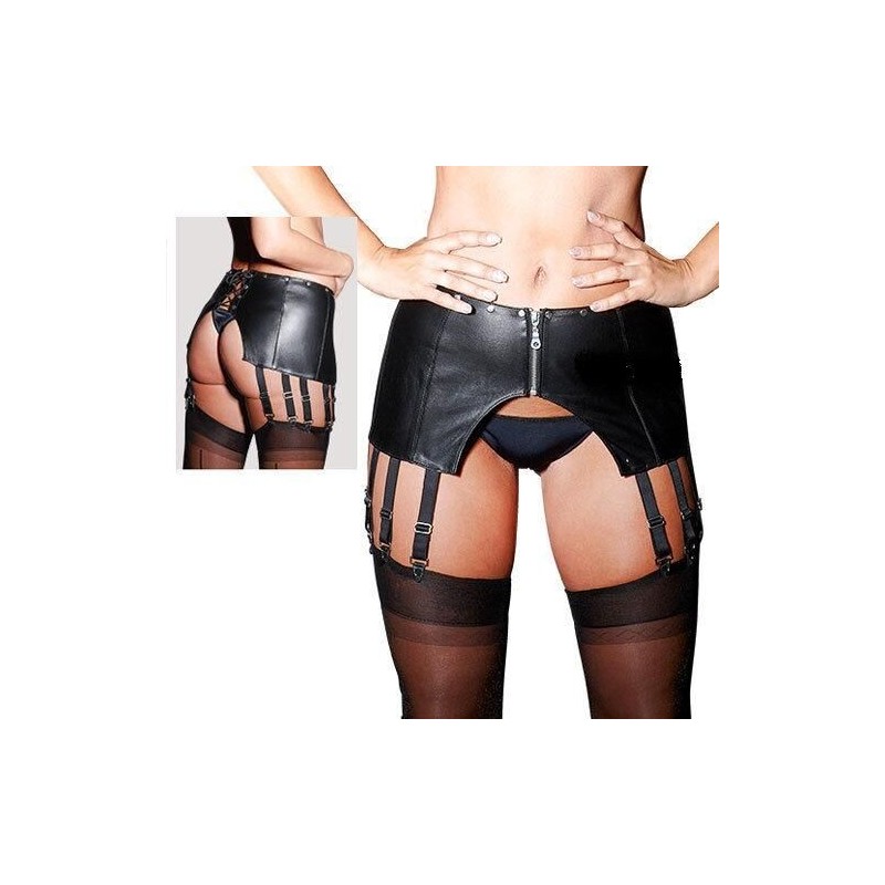 Loguero largo de 12 ligas , imitación de cuero en color mate, remaches decirativos en la cadera en la parte frontal tiene una cremallera y detrás un cruzado de cuerdas para que lo puedas adaptar a tu talla valido para una M,L o XL