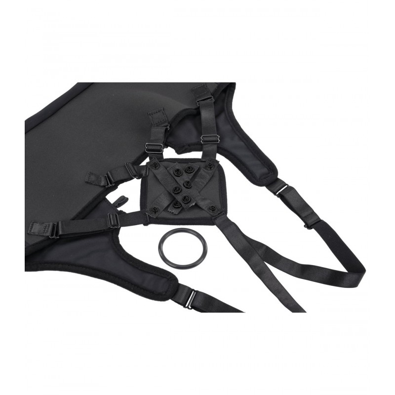 - Seis bandas elásticas ajustables conectan el acolchado frontal para una colocación precisa del consolador.