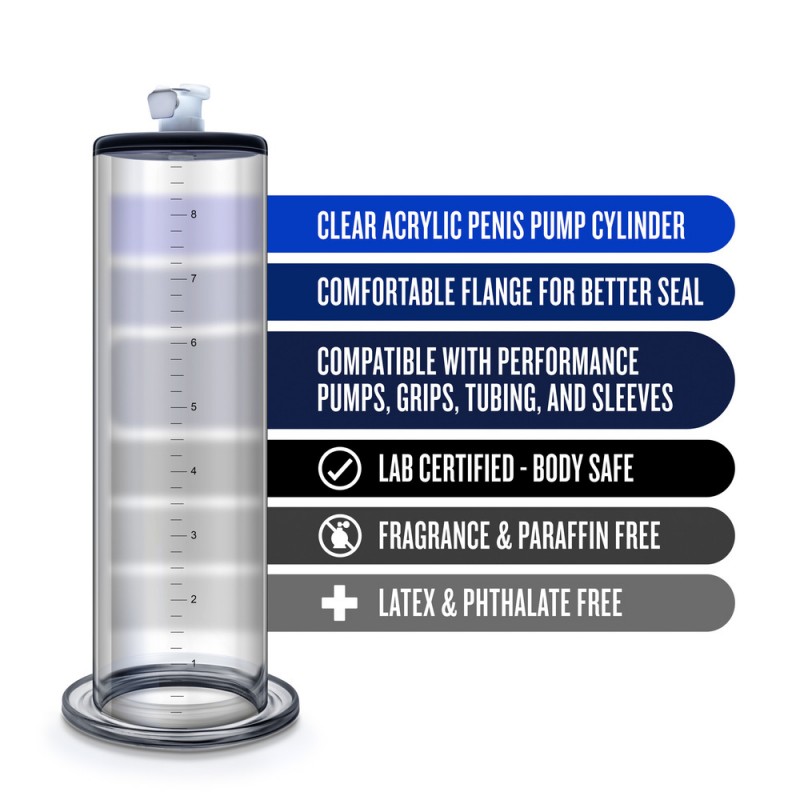 Cilindro de alta resistencia para desarrollar el pene, fabricado en PVC transparente una distancia longitud de 22,9 cm y un grosor a seleccionar , con válvula de no retorno que permite retirar la bomba sin perder el vacío incluye manga de silicona para un sellado perfecto .