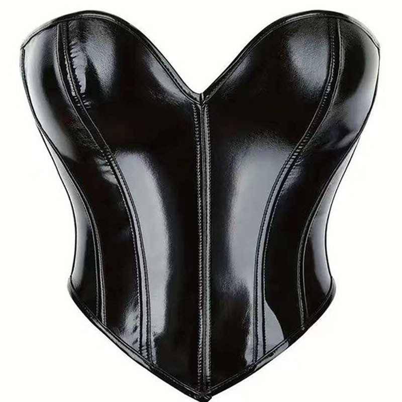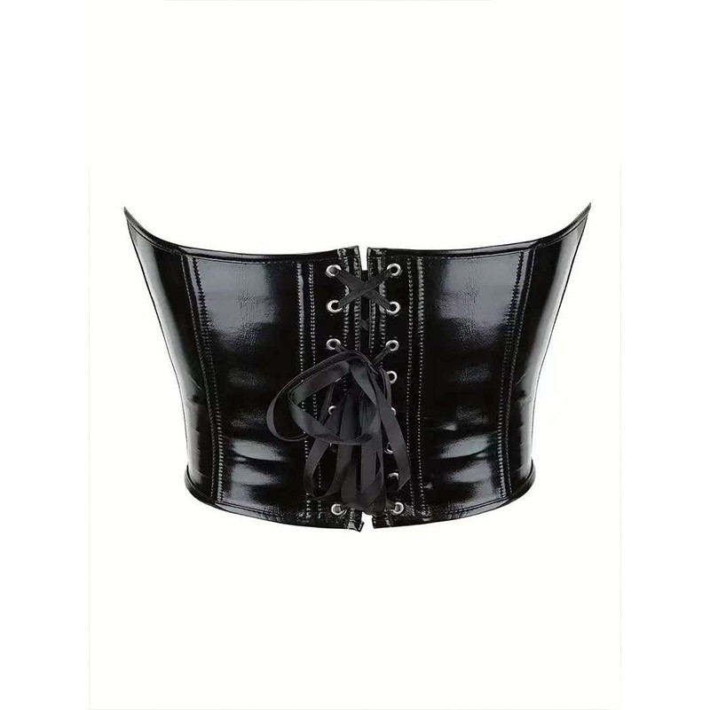 Este corpiño está hecho de PVC super brillante y elástico. La copa del pecho con algo de relleno y aros para brindarte soporte total. Está diseñado para definir la cintura y acentuar la línea del busto. Tiene cruzado de cuerdas para que se ajuste a tu talla.