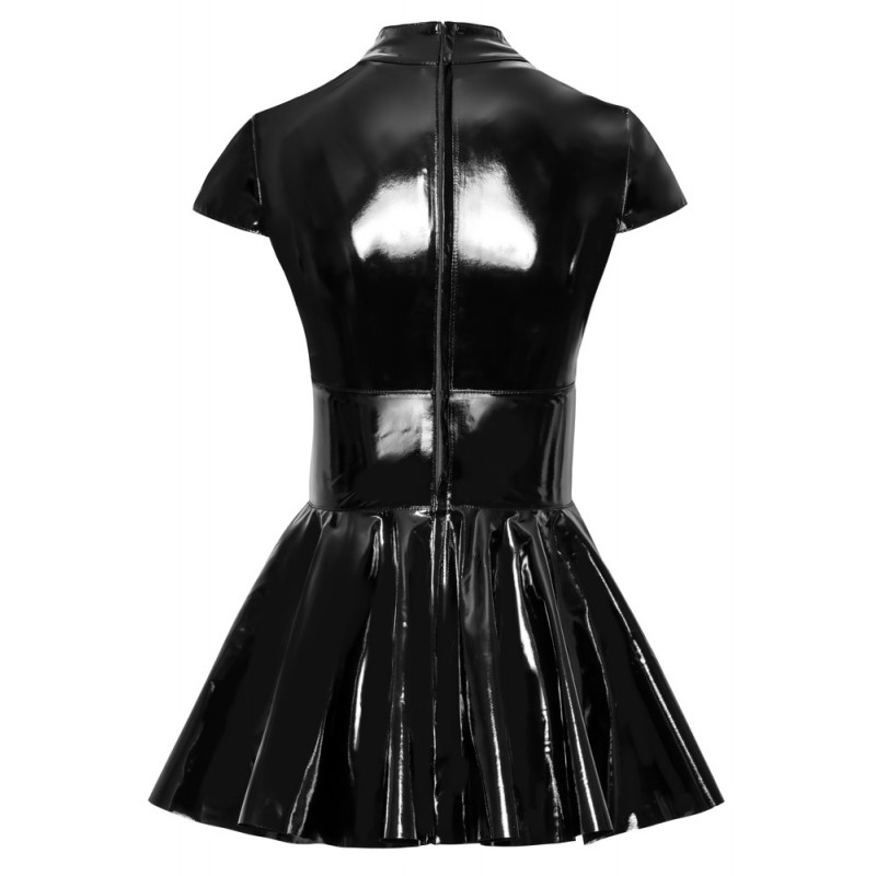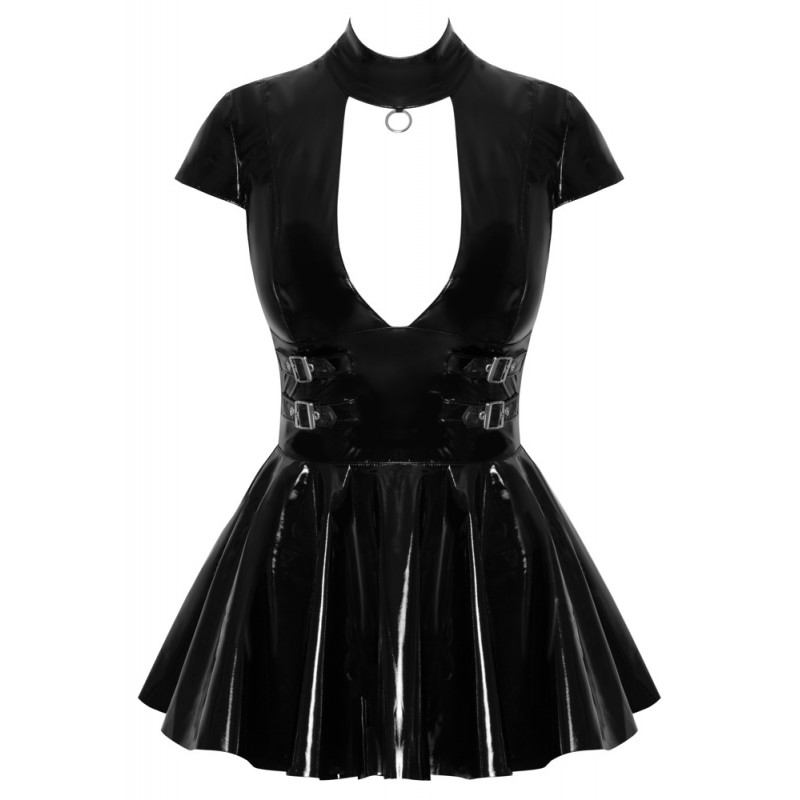 Minivestido de Black Level completamente en charol negro brillante. Corte ajustado y falda acampanada. Mangas cortas y estricto cuello alto con anilla (bondage) en la parte delantera. Gran abertura en el escote. Con 2 tirantes ajustables con hebilla a los lados de la cintura. Cremallera completa en la espalda.